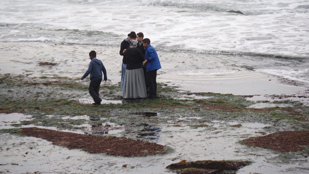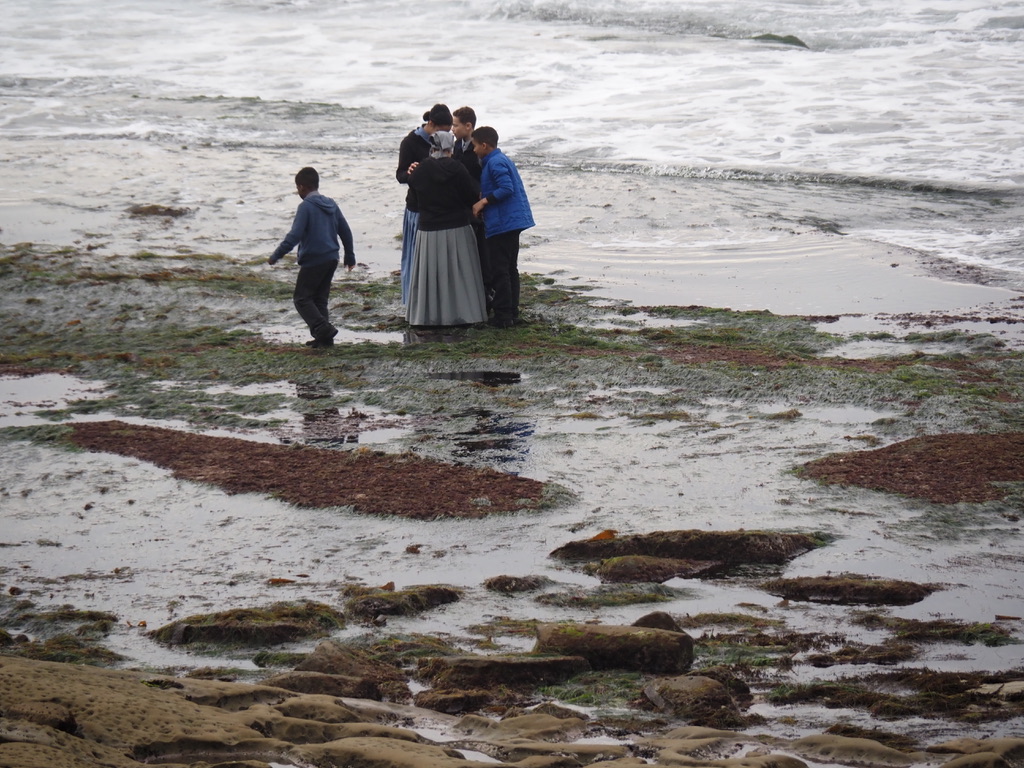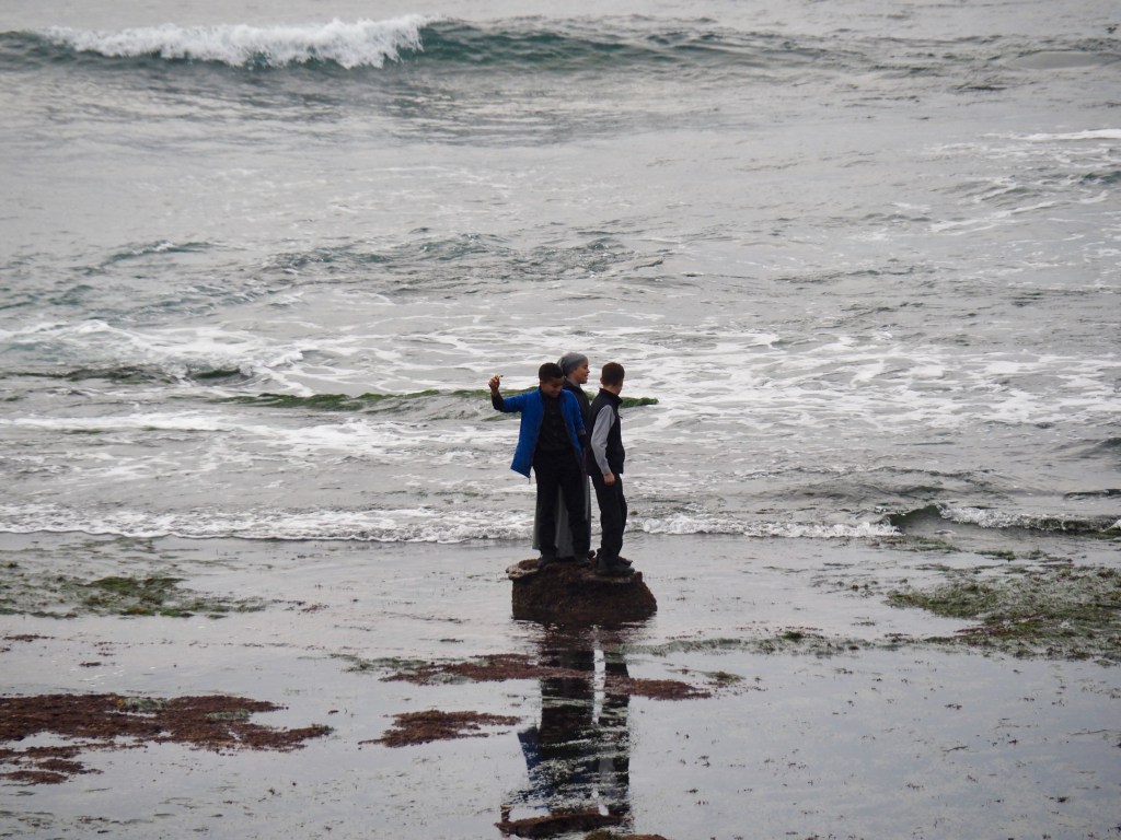 Then, riding on, a little further south, I found an empty bench to eat a sandwich I’d packed. A seagull swooped in and tried to steal my lunch, tangling itself momentarily in my hair. Then I turned my attention to a religious group out exploring the tidepools. I watched them for awhile as they walked on the slippery rocks and huddled and talked and played. I would like to have known what they talked about. Little fishes swimming in tidepools? Spiritual things like the marvels of life and nature? Nonsensical things like whether that was Beyonce they saw? Where they might go for dinner?
