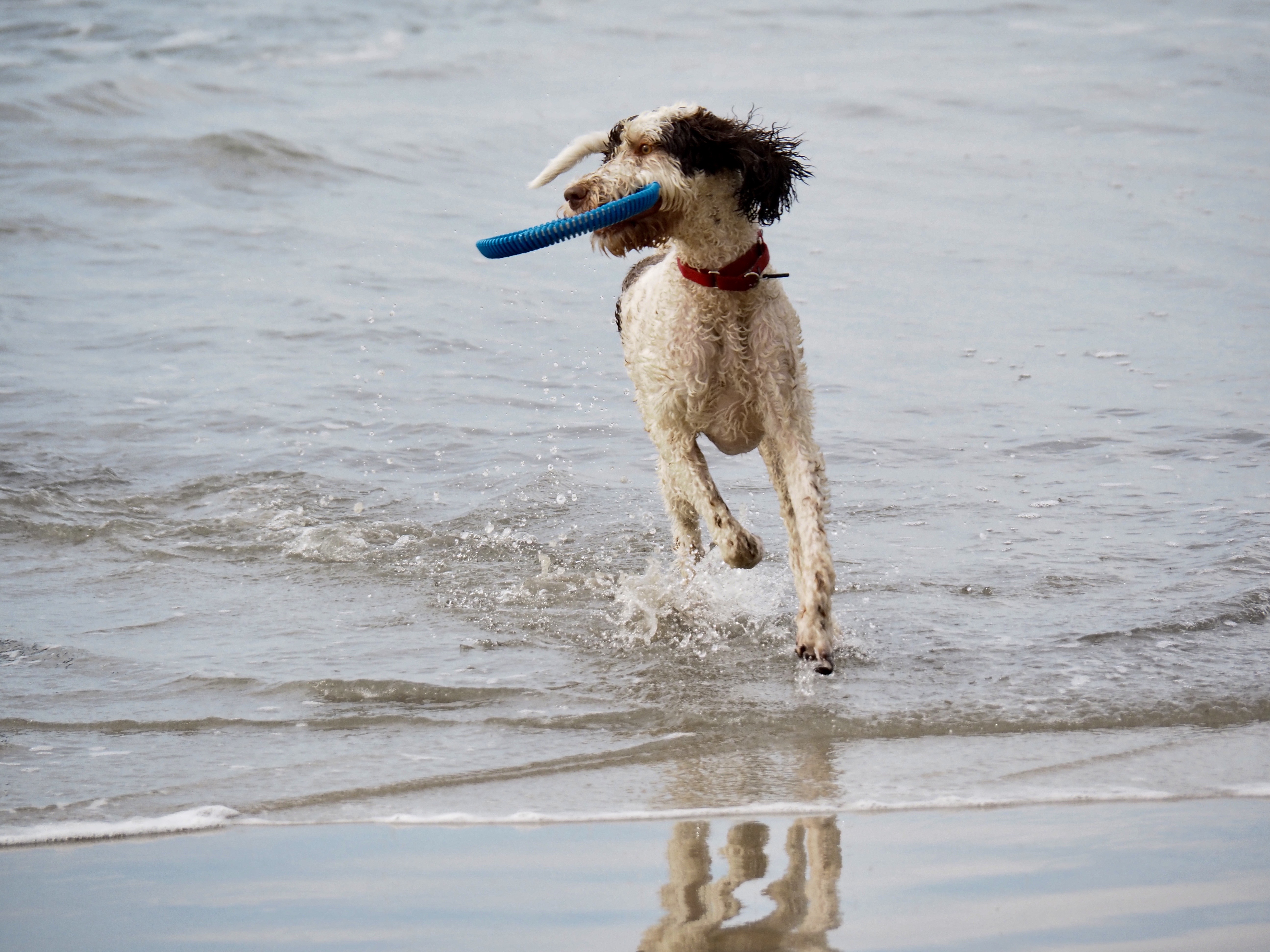On a recent early winter’s day, I saw a dog running in the afternoon surf with a frisbee trophy clamped in its teeth. I took his picture a half dozen times playing with a half dozen other dogs, running and chasing, tails flashing, teeth grinning, tongues flopping.