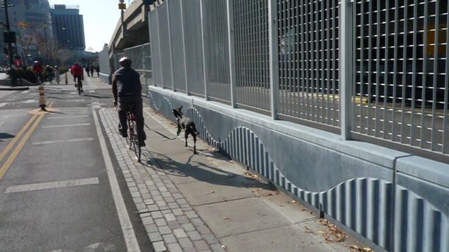Dog running alongside a bike, along 12th Avenue somewhere in the 50s today.