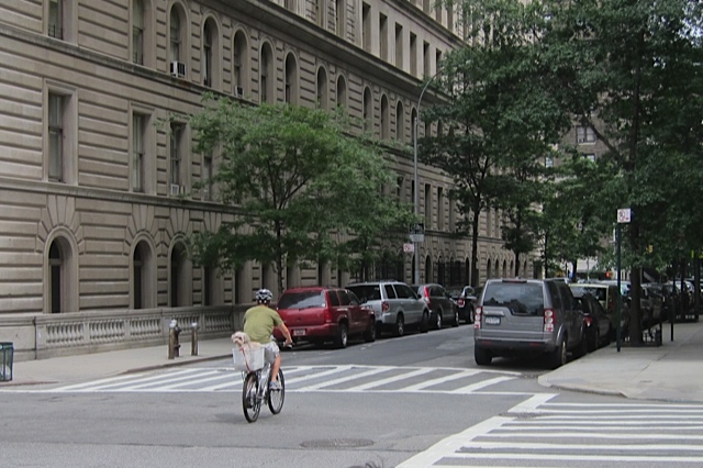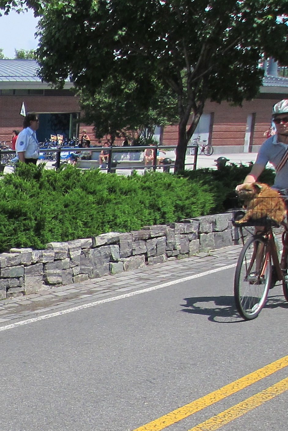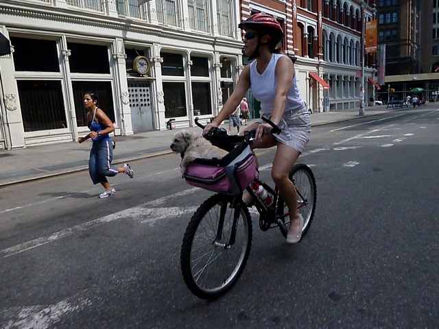 A Navy swing band played and people clapped and everyone acknowledged that, hey, sure it’s humid and crowded, but dammit, we’re civilized and having a good time anyway. After just two or three blocks on foot, I resumed my ride, enjoying the breeze, the pure joy of moving. And then this fellow approached with a dog in his basket. I saw them from a distance, with more than enough time to get the shot. I pulled the camera from my pocket and snapped a shot. But there was glare and when I reviewed it, I saw that I had just barely gotten the dog in frame.