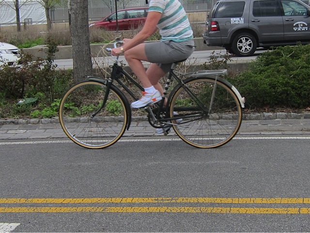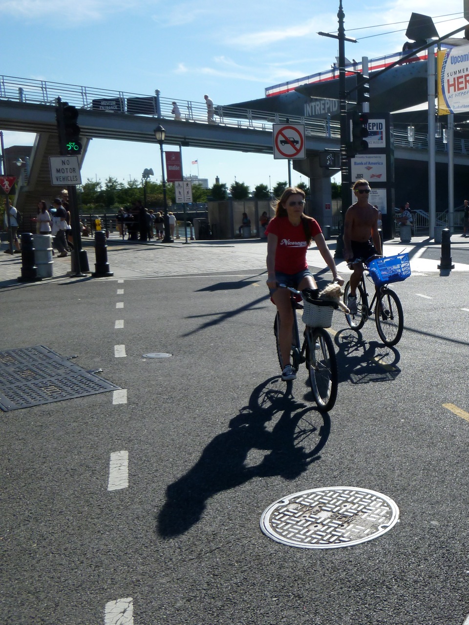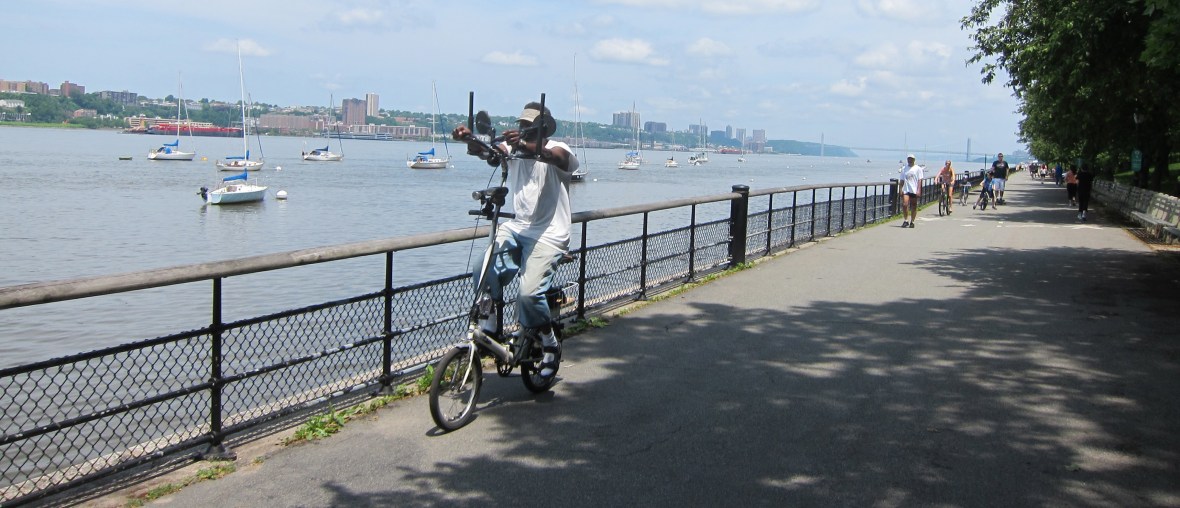 I came to the Hudson Greenway along the West Side Highway at Chelsea Piers to take in the sights and headed north. I knew it was Fleet Enema Week and that there would be crowds, huge crowds and that I’d have to dismount for a couple of blocks starting at the Intrepid. Rather than loathe this interruption, I looked forward to it. Looked forward to the crush of tourists, enlisted personnel, joggers, amblers, and wide walkers.
