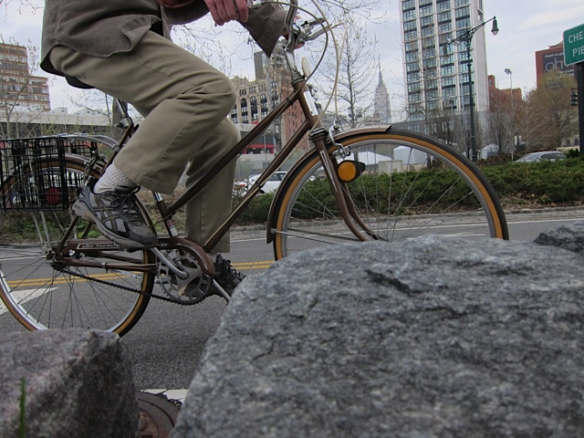 Memorial Day, 2011–I’ve been going about it all wrong, this riding in the city business. Rushing, competing with pedestrians, with cars, with other cyclists. Trying to make the light, running the light, cursing the oblivious and the reckless. You know, the city can do that to you. Make you harder, more persecutorial (which may be a made up word), more intent on destruction than you really are. What if, rather than compete, I were to seek harmony in my jaunts around town?