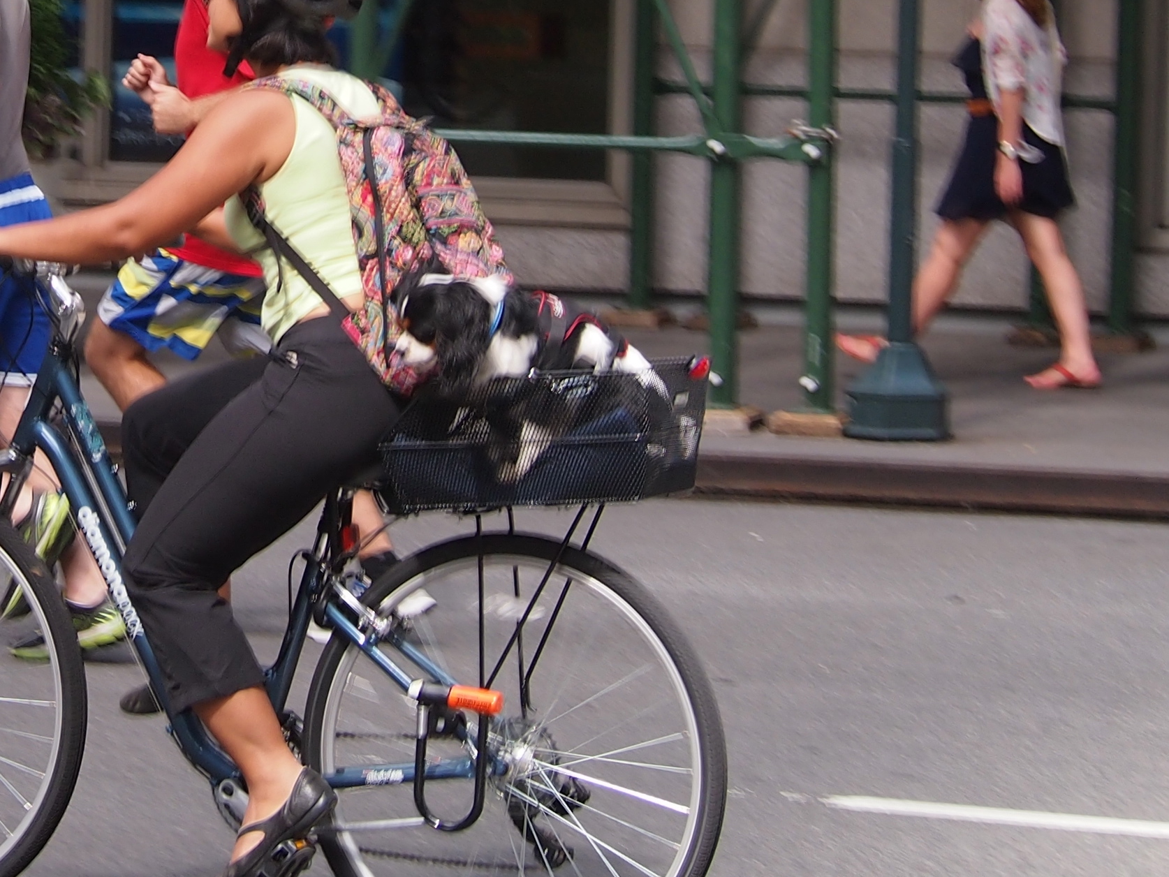 A few years ago, I had been on a longish ride from the Upper West Side of Manhattan to the George Washington Bridge, down to Battery Park and back to where I started. I had my camera with me but despite the perfect weather had not seen a single dog in a basket all day. I was somewhere in the 50s, block-wise, and passed this young woman and dog going the opposite direction. I did a u-turn, passed them and waited for them to ride by, which they did.