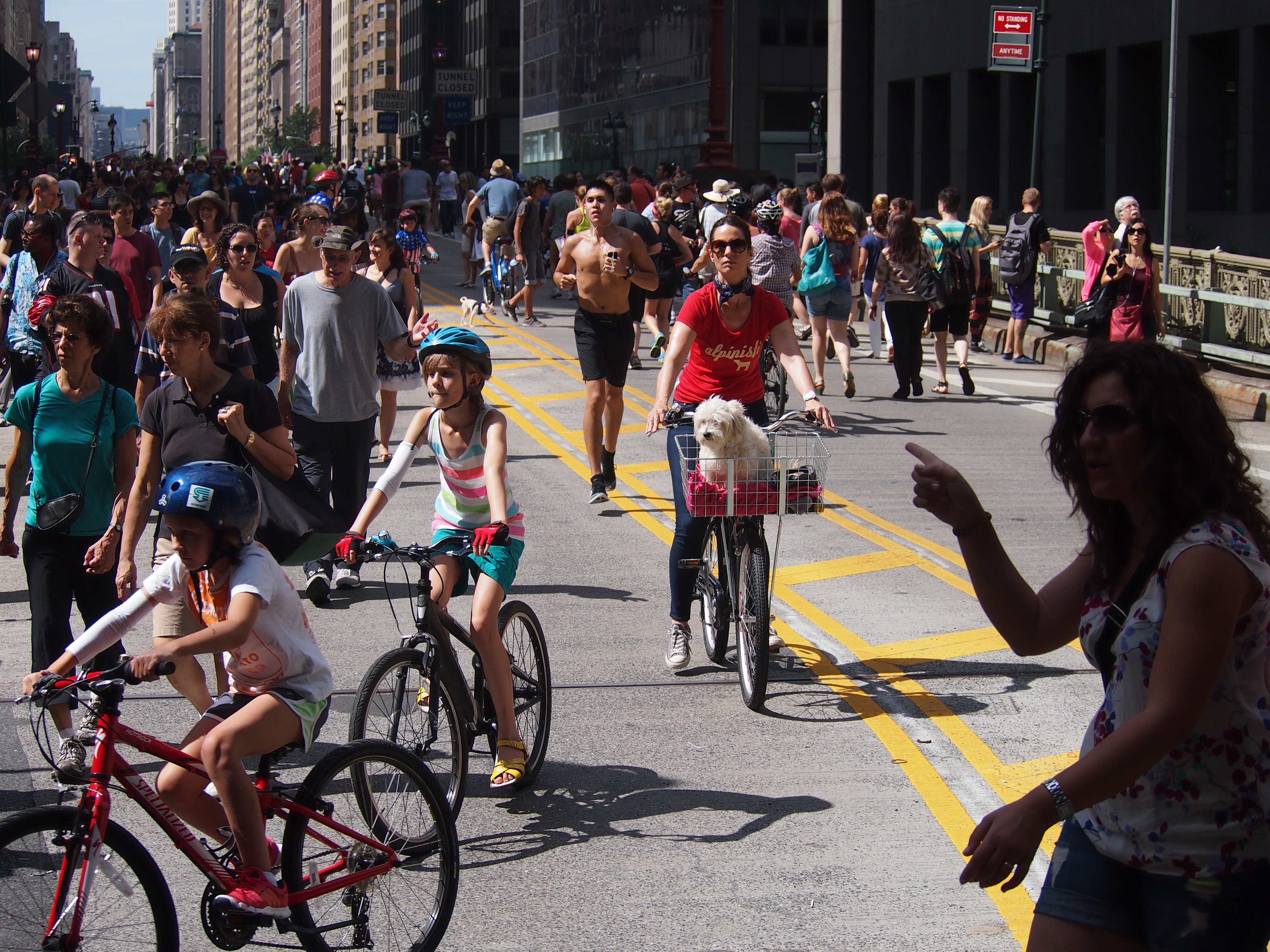 I found a folder of photos from last year’s Summer Streets, three Saturdays in August each year when Park Avenue/Lafayette Street from the Brooklyn Bridge to 72nd Street is closed to cars. I get a kick out of the dog peering over the basket slightly cross-eyed, the big bell on the handlebars, the funky panniers, and of course the red sneakers.