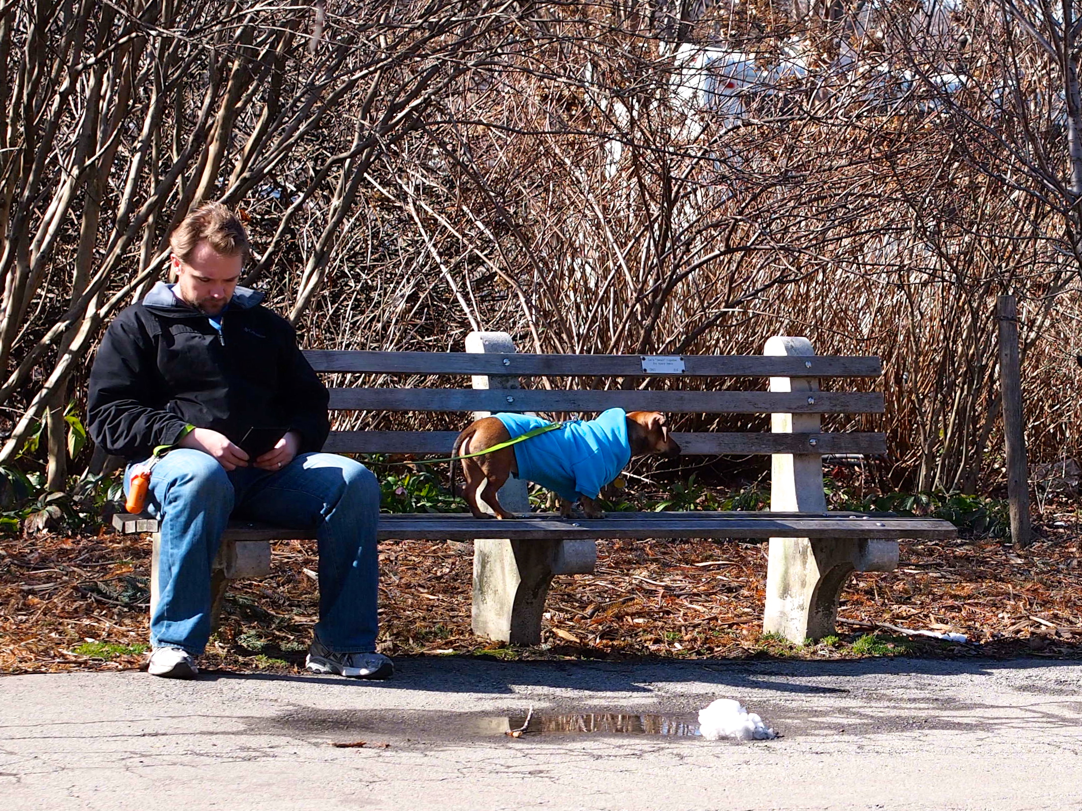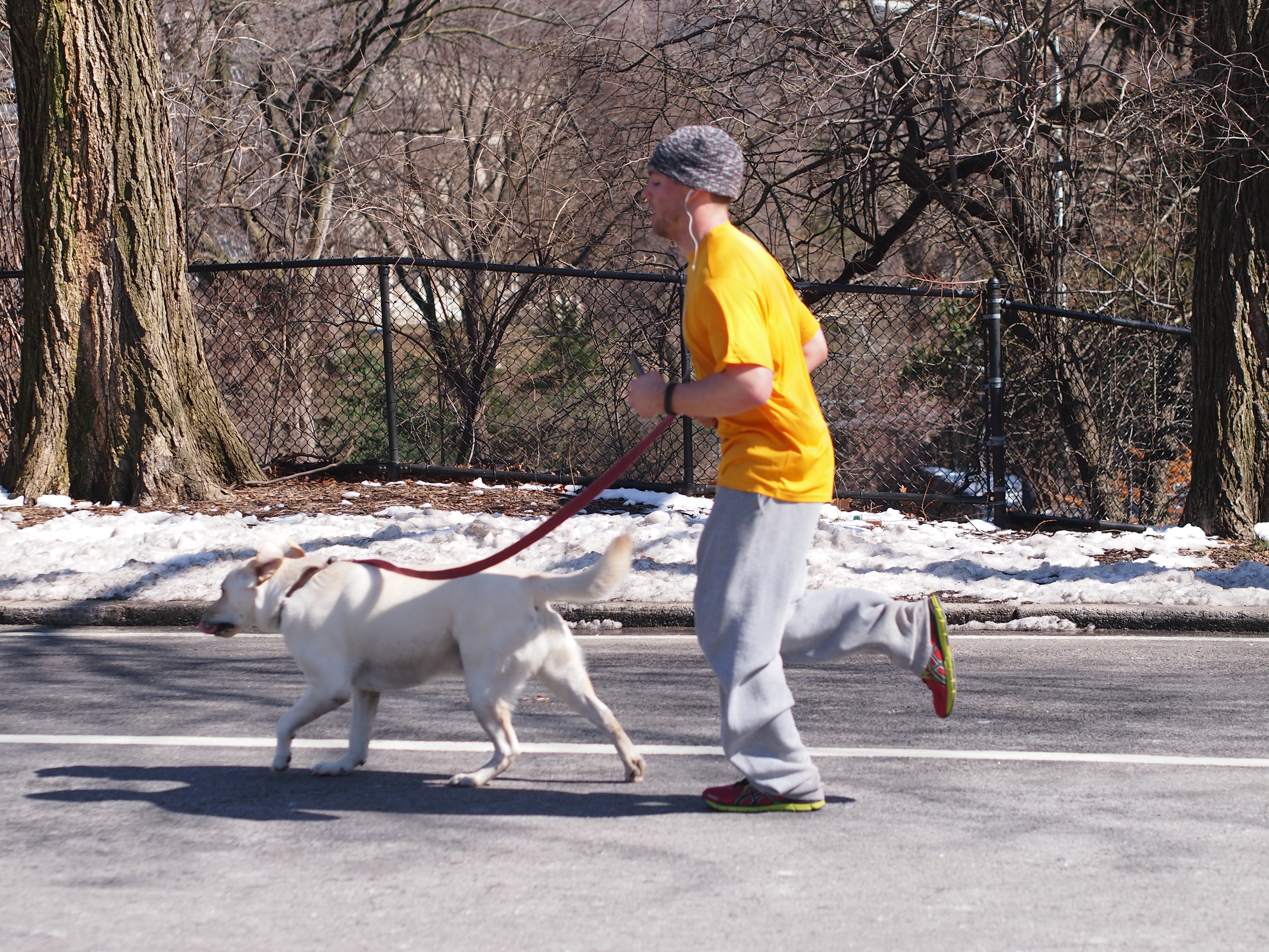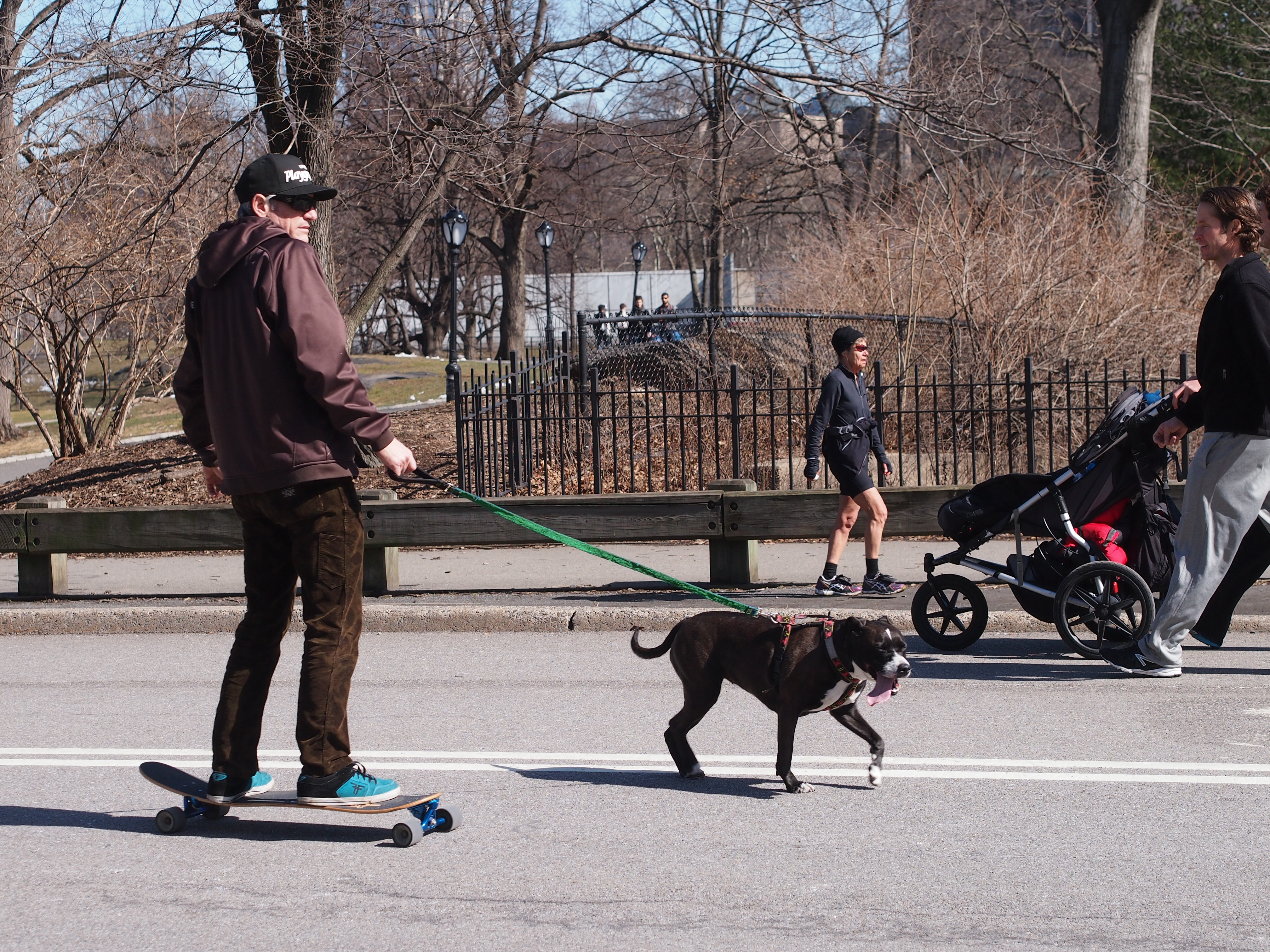 I passed this fellow with his pit bull pulling him up a hill in Central Park. The man kicked the ground to help him up the hill, but his animal did most of the work and seemed quite happy in doing so, tongue flopping around, breathing hard, tail wagging. This was work and most dogs live for work, or some I’m told. I’m not a dog and I live more for days like yesterday and today with a good deal of leisure and a 32GB SD card at my disposal.